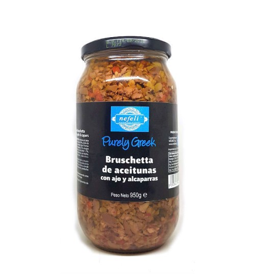 La Bruschetta es una colorida mezcla de aceitunas griegas de Kalamata y Halkidiki, ajo, tiras de pimienta Florina roja, alcaparras y orégano silvestre que resulta en la perfecta combinación de sabores griegos. Puede disfrutarse en ensalada o sobre una tostada.