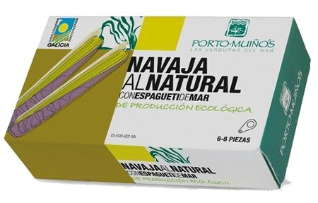 Deliciosas navajas al ajillo con espagueti de mar de producción ecológica. Marisco con algas que brotan en las rías gallegas, lo recogen artesanalmente para acompañarlas después con agua artesanalmente.